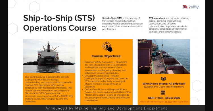 This training course is designed to provide participants with the knowledge, understanding, and practical skills required to conduct STS operations safely and in compliance with international standards.